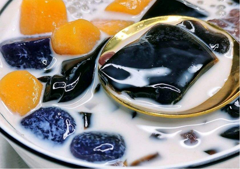如果你能夠做到這里,我們就同時(shí)擁有了芋圓和仙草凍,但是在我們做的過(guò)程中沒(méi)有放糖,如果你干吃的話會(huì)很淡,可以配一些紅豆、煉乳、細(xì)砂糖和牛奶搭配著吃。麻煩你,芋圓仙草凍整起來(lái)吧~