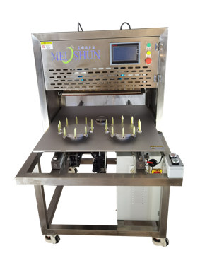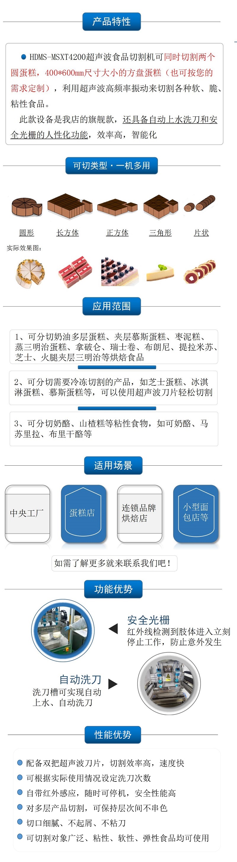 該設(shè)備配備單把超聲波刀片,可切圓形(只限一個(gè)圓蛋糕),也可切方形